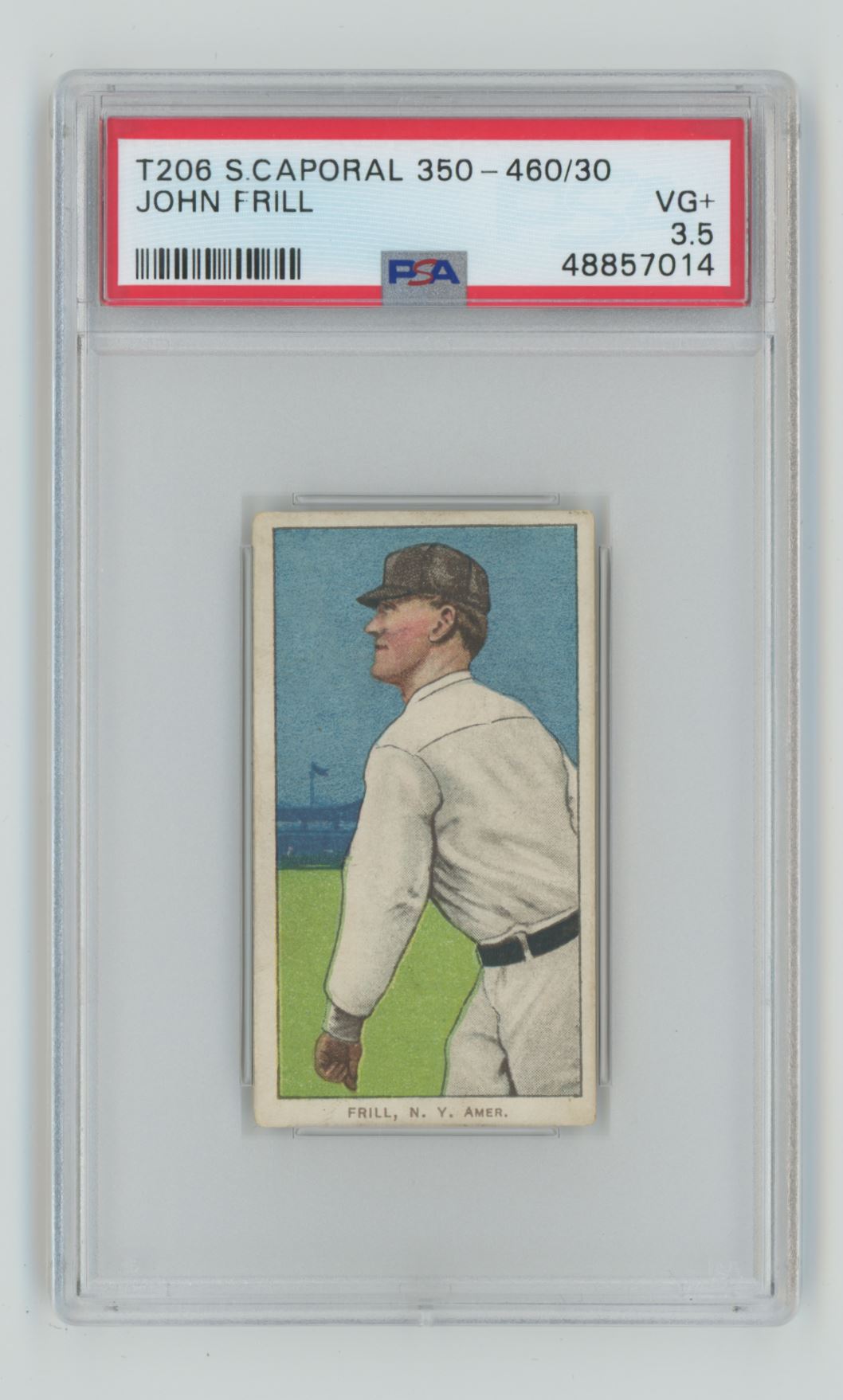 Rare 1910 Sweet Caporal White Border John Frill PSA 3.5 card featuring New York team. Authentic scans, perfect for any baseball card collector.