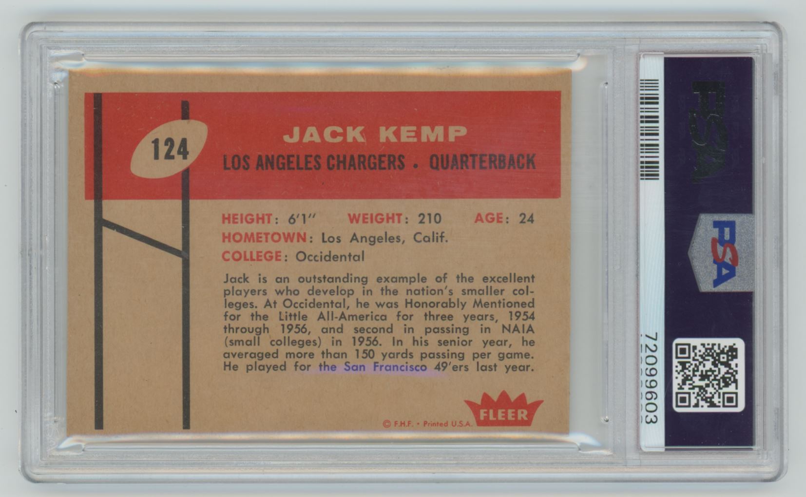 | 1960 FLEER JACK KEMP ROOKIE PSA 7 LOS ANGELES CHARGERS #124 | ||||||||||||||||||||