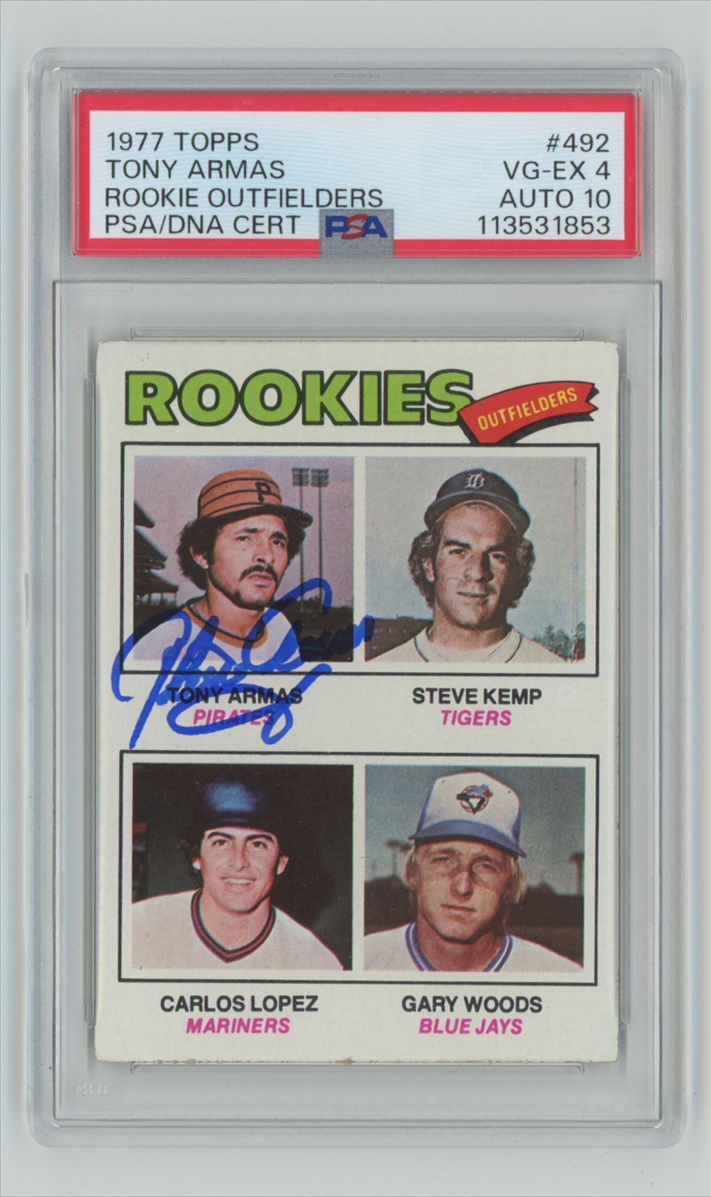 | Description: | Rookie Outfielders – Tony Armas/Steve Kemp/Carlos Lopez/Gary Woods | | Category: | Baseball | | Year: | 1977 | | Product: | Topps | | Team: | Pittsburgh Pirates/Detroit Tigers/Seattle Mariners/Toronto Blue Jays | | Card Number: | 492 | | Grade: | 4 PSA | | Hand Signed: | Yes | | Rookie: | Yes | | Dimensions: | 5½" x 3¼" | | SKU: | BL B0780 R02 A (9) |