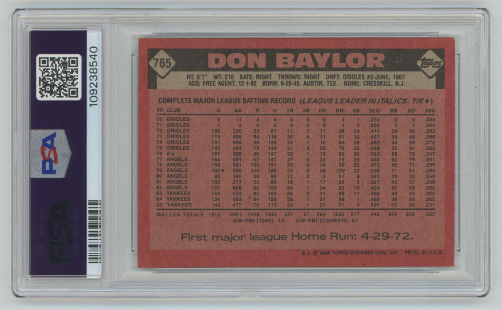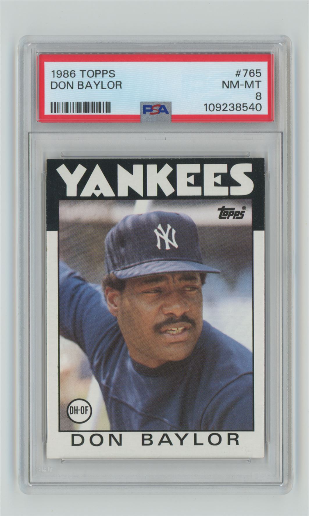 | 1986 TOPPS DON BAYLOR PSA 8 NEW YORK YANKEES #765 POP 11, TOTAL POP 29 |