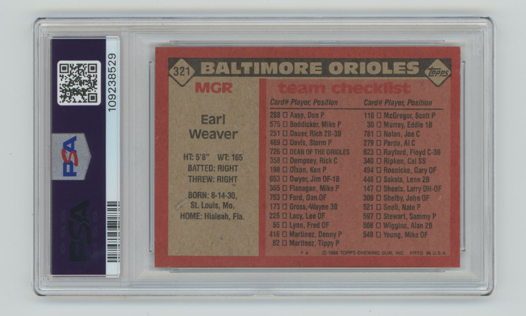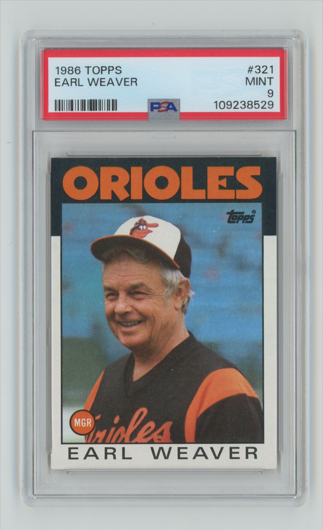 | 1986 TOPPS EARL WEAVER PSA 9 BALTIMORE ORIOLES #321 POP 17, TOTAL POP 50 |