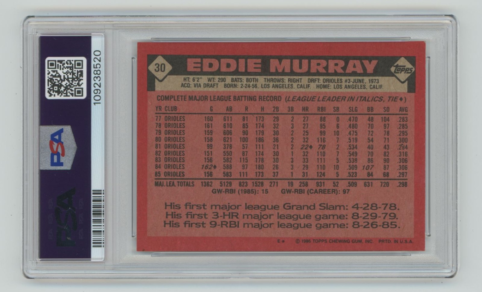 | 1986 TOPPS EDDIE MURRAY PSA 6 BALTIMORE ORIOLES #30 | ||||||||||||||||||