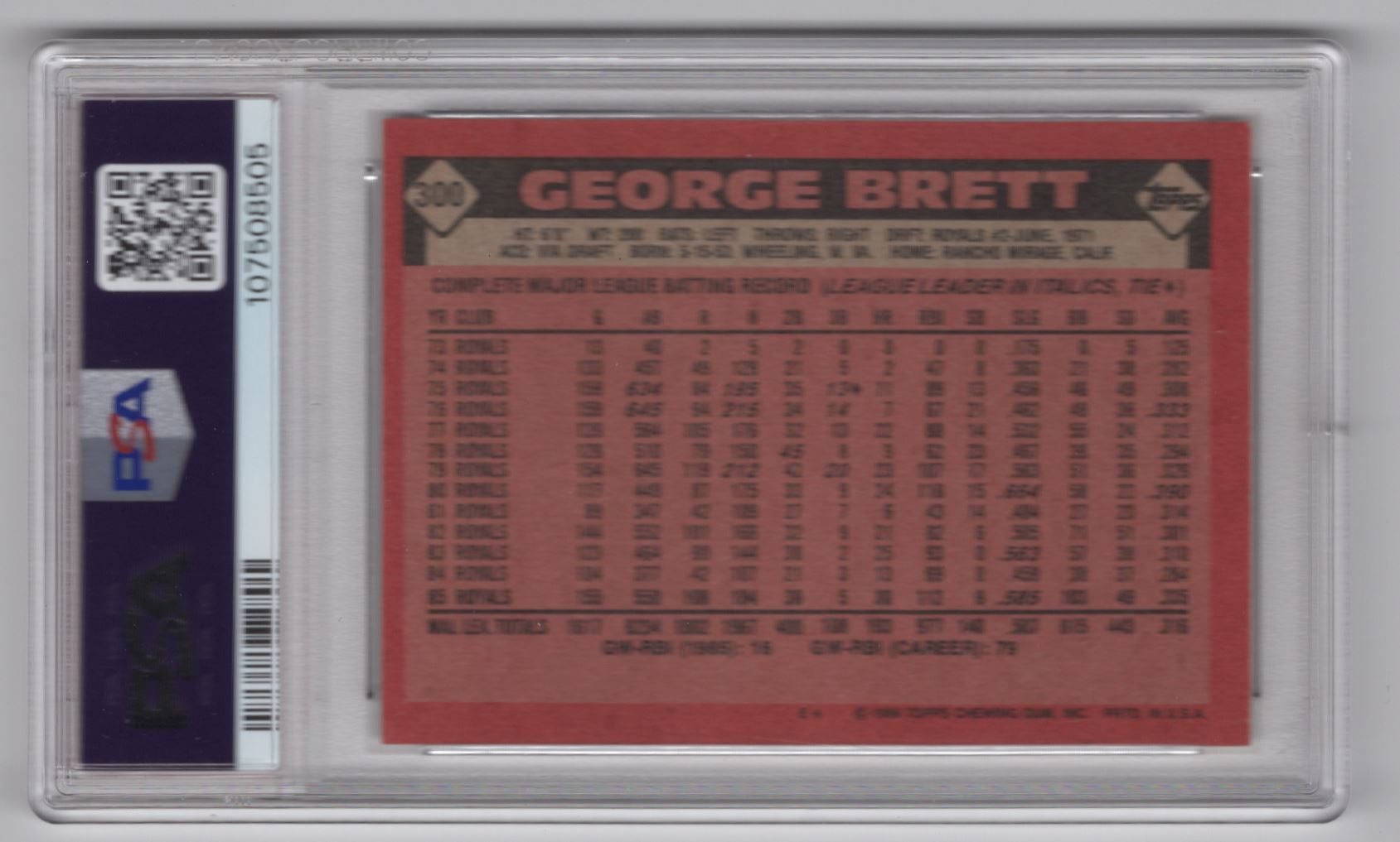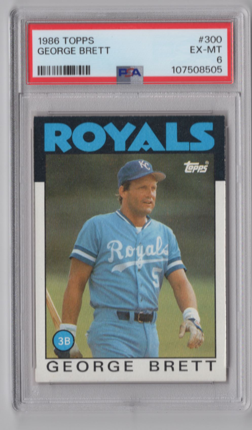 Own a piece of baseball history with this 1986 Topps George Brett PSA 6 card from the Kansas City Royals. Perfect for any collector!