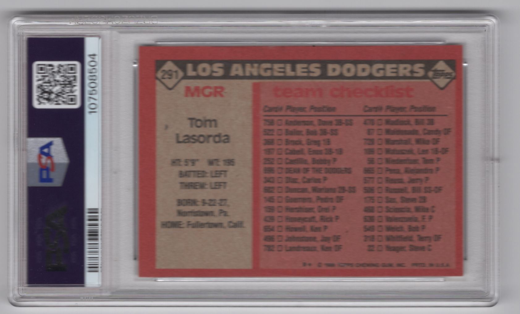 | 1986 TOPPS TOMMY LASORDA PSA 8 LOS ANGELES DODGERS #291 TOTAL POP ONLY 56 |