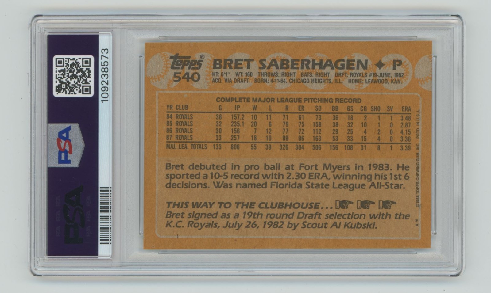 | 1988 TOPPS BRET SABERHAGEN PSA 5 KANSAS CITY ROYALS #540 POP 1, TOTAL POP 18 |