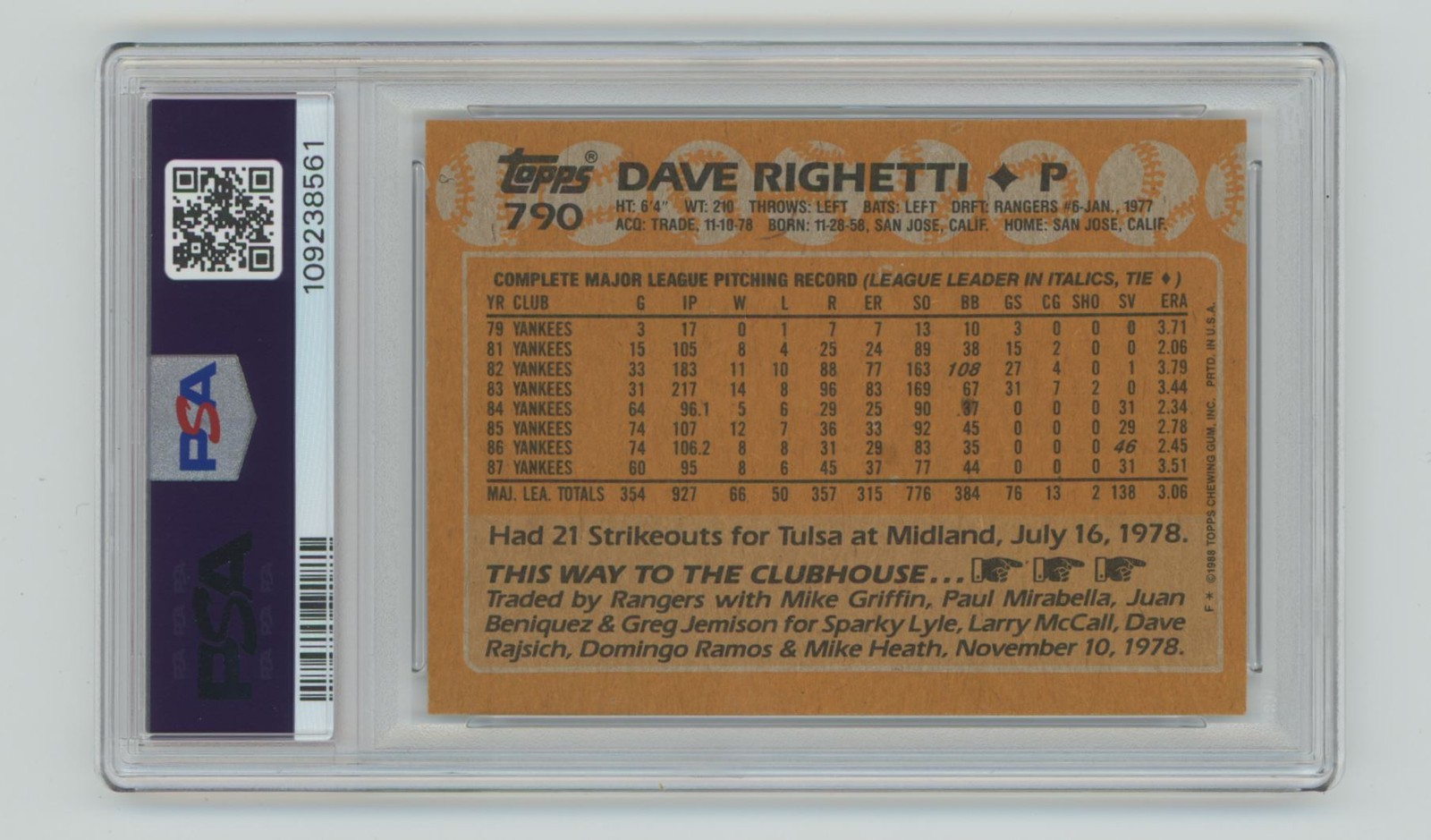 | 1988 TOPPS DAVE RIGHETTI PSA 8 NEW YORK YANKEES #790 POP 4, TOTAL POP 18 |