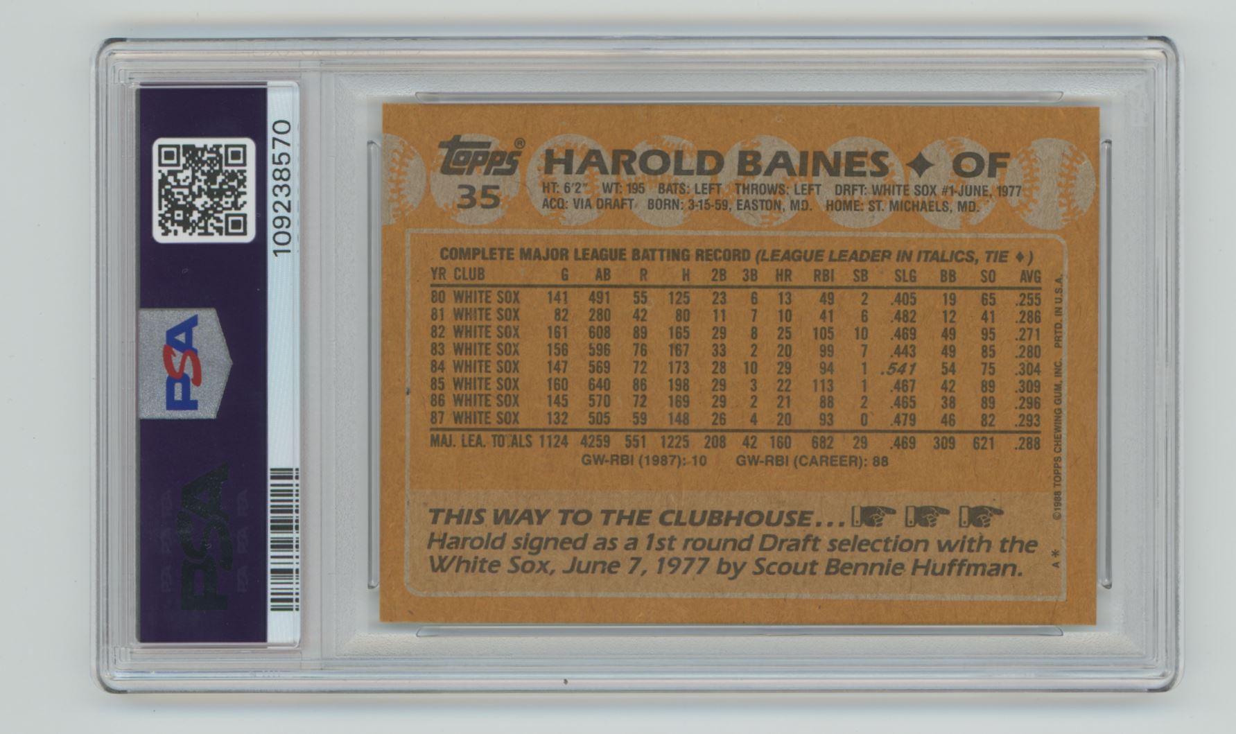 | 1988 TOPPS HAROLD BAINES PERFECT PSA 10 PSA 10 CHICAGO WHITE SOX #35 TOTAL POP |