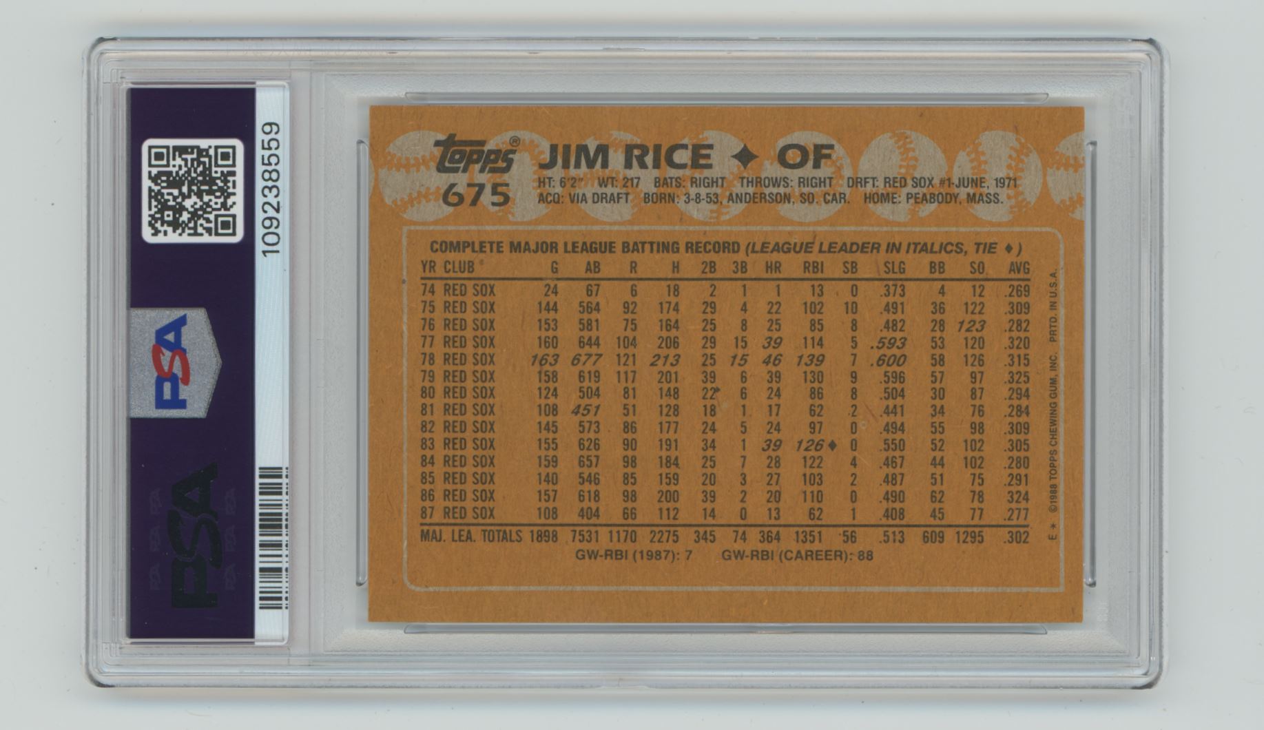 | 1988 TOPPS JIM RICE PSA 7 BOSTON RED SOX #675 POP 5, TOTAL POP 121 |