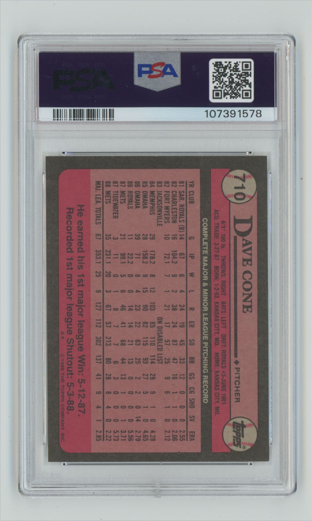 | 1989 TOPPS DAVE CONE PSA 9 NEW YORK METS #710 POP 2 ONLY 4 HIGHER |