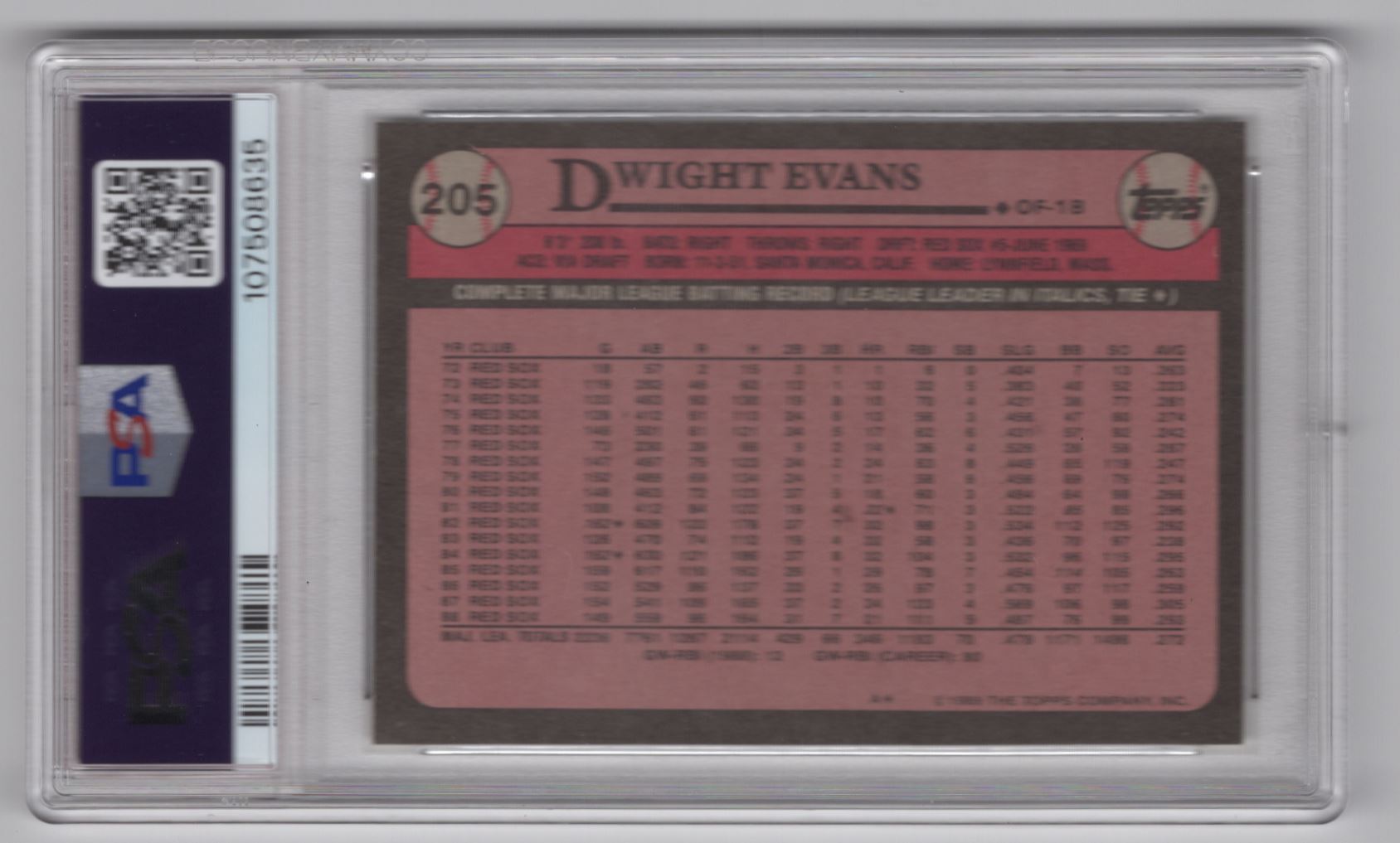 | 1989 TOPPS DWIGHT EVANS PSA 10 BOSTON RED SOX #205 PERFECT PSA 10, POP 35 NONE |