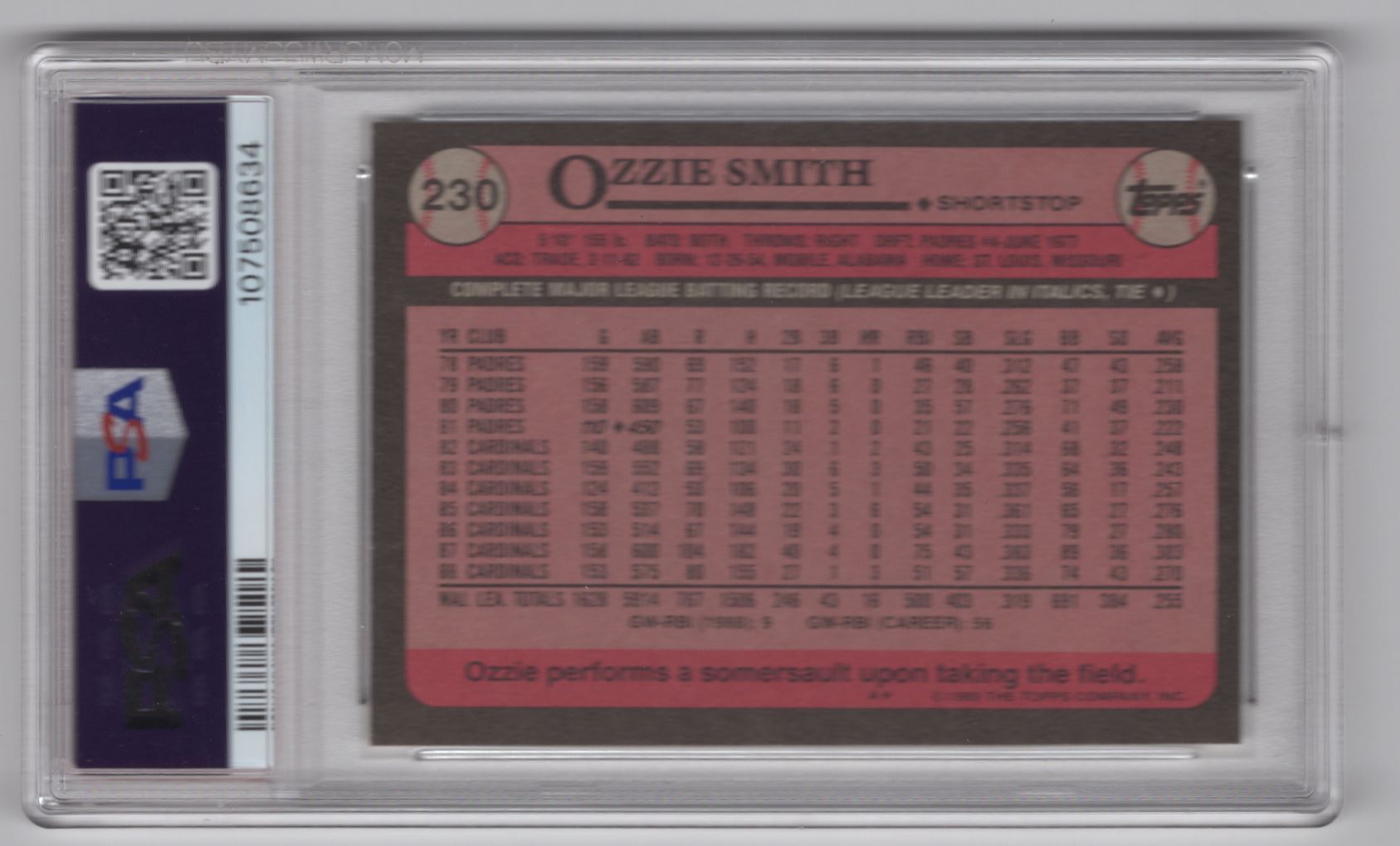 Own a piece of baseball history with this 1989 Topps Ozzie Smith PSA 9 card featuring the St. Louis Cardinals legend. Perfect for any collector!