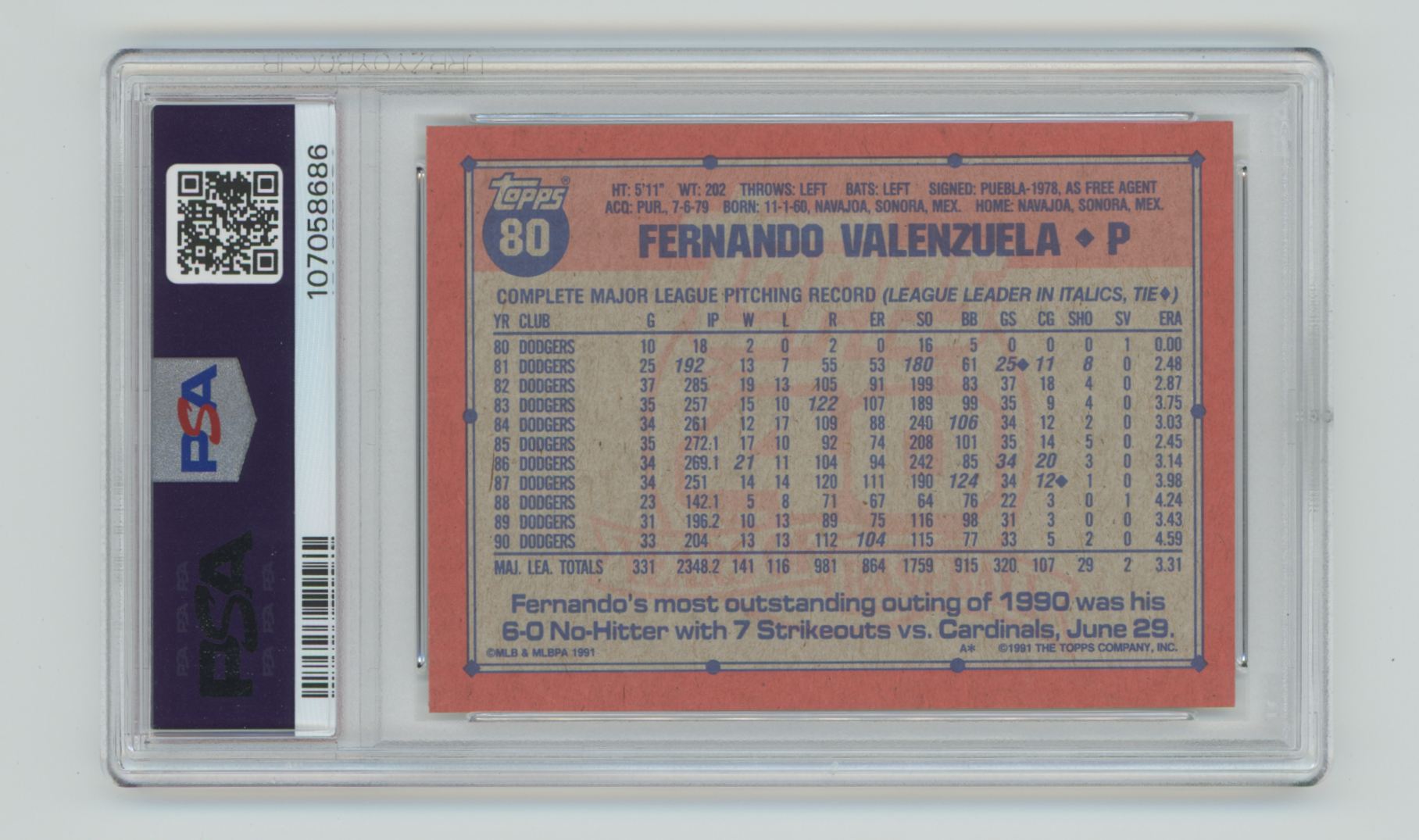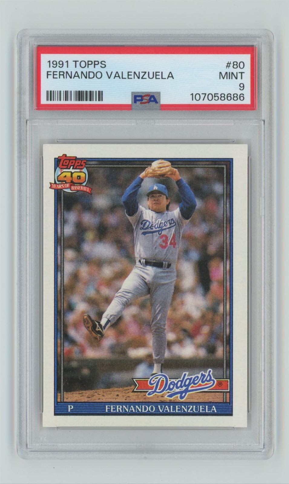 1991 TOPPS FERNANDO VALENZUELA PSA 9 LOS ANGELES DODGERS #80 POP 10 ONLY 16