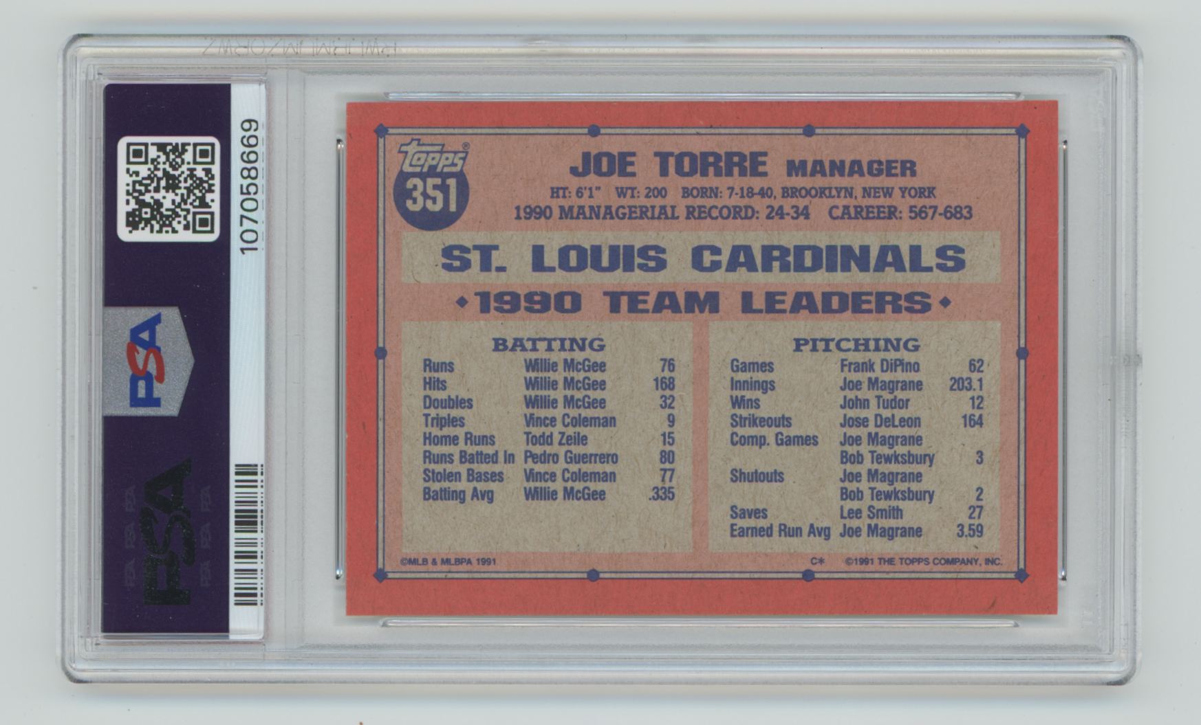 | 1991 TOPPS JOE TORRE PSA 9 ST. LOUIS CARDINALS #351 POP 13 ONLY 9 HIGHER |