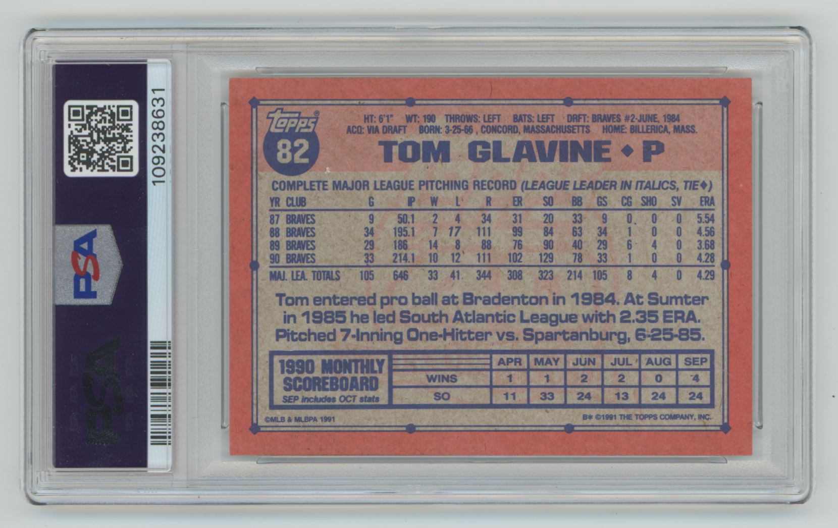 1991 TOPPS TOM GLAVINE PERFECT PSA 10 PSA 10 ATLANTA BRAVES #82 TOTAL POP 69