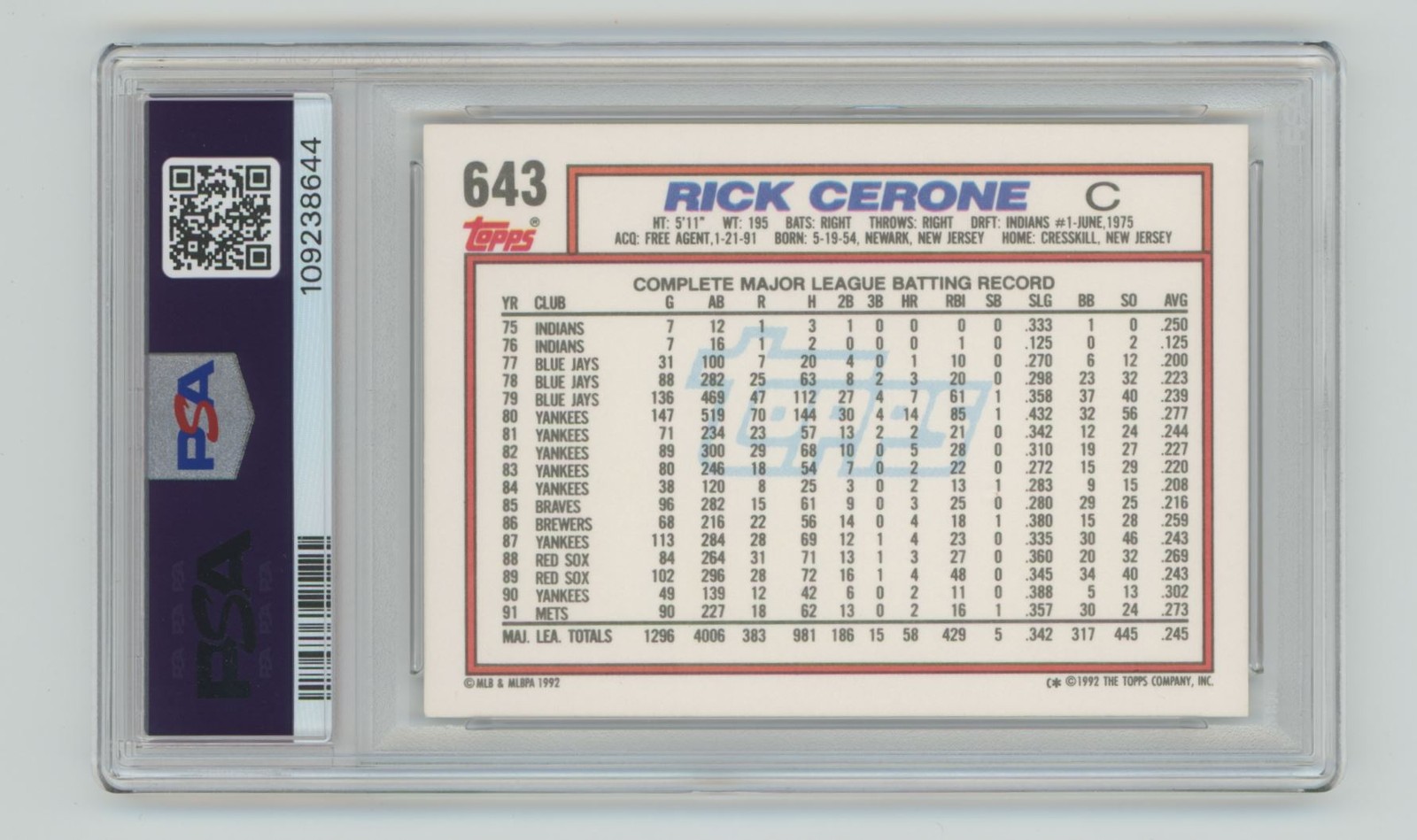 | 1992 TOPPS RICK CERONE PSA 7 NEW YORK METS #643 POP 1, ONLY 6 HIGHER |