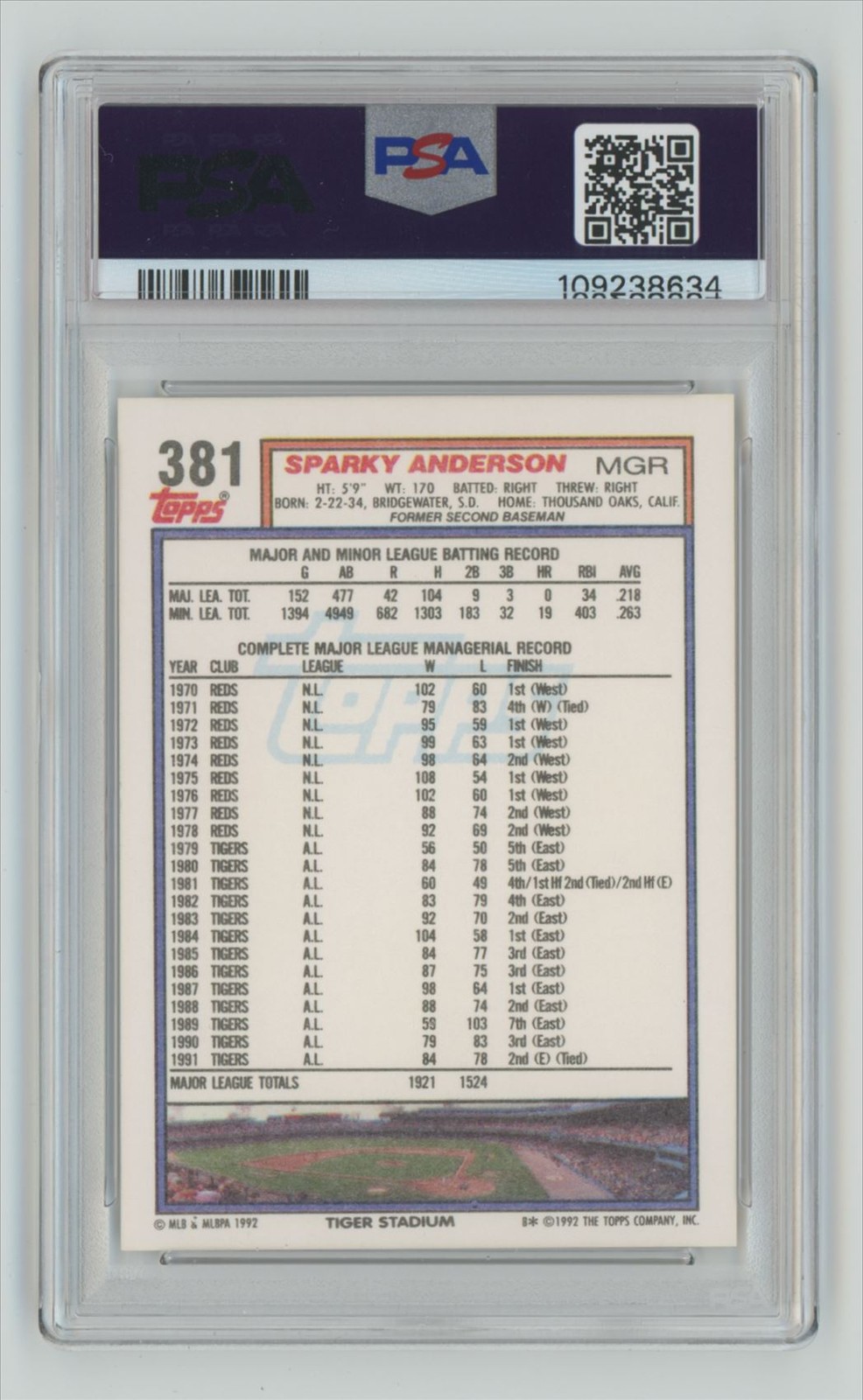 | 1992 TOPPS SPARKY ANDERSON PSA 9 DETROIT TIGERS #381 POP 11, TOTAL POP 73 |