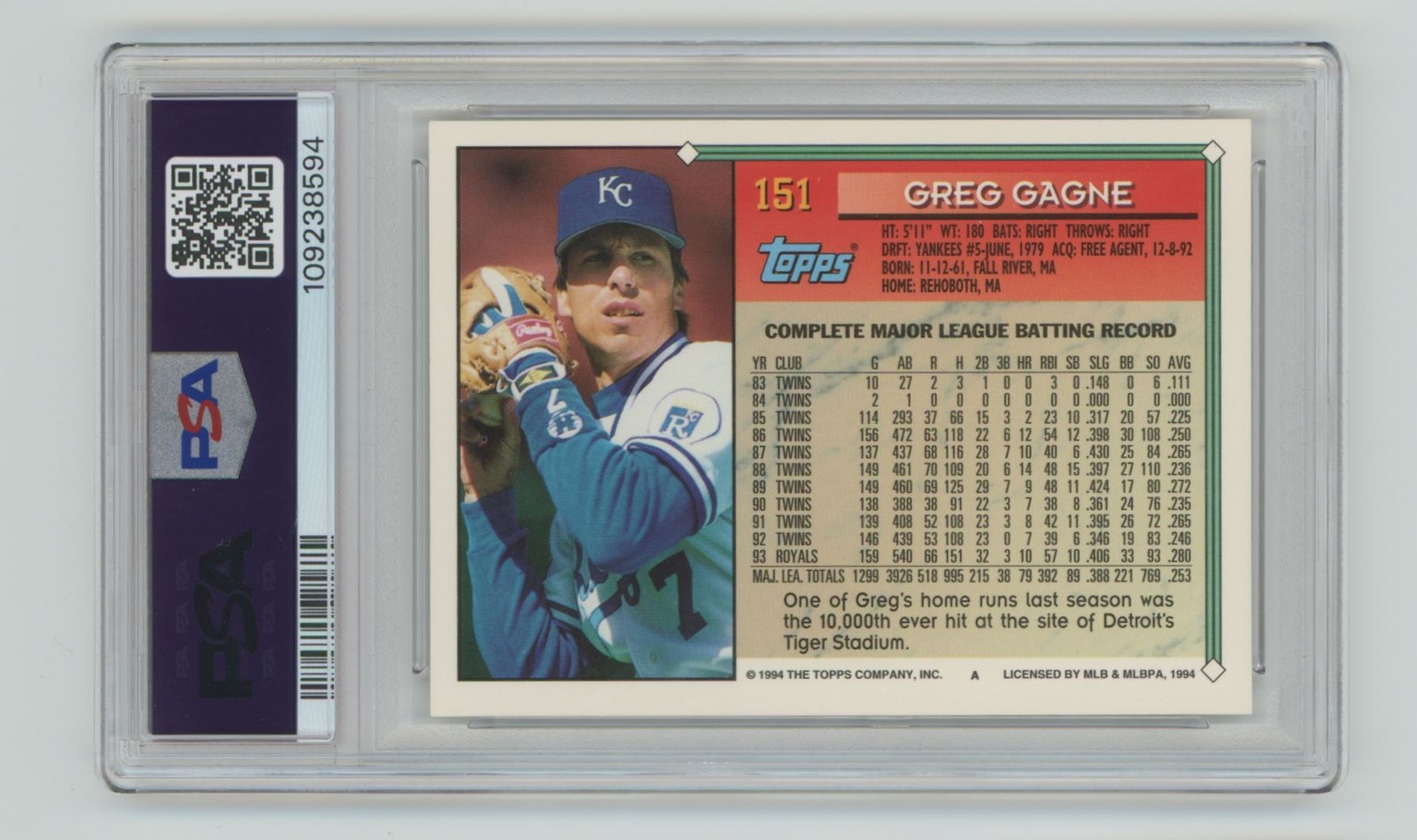 | 1994 TOPPS GREG GAGNE PSA 8 KANSAS CITY ROYALS #151 RARE POP 1 OF 2 |