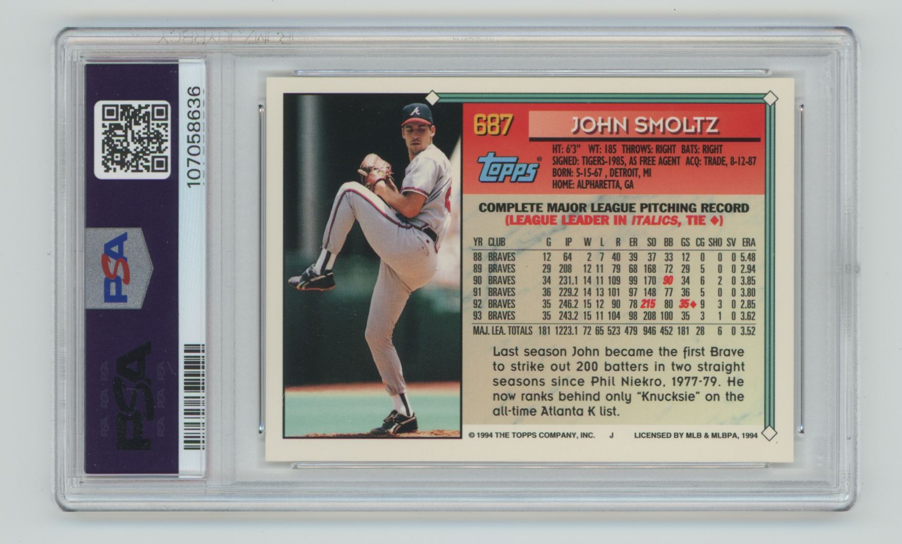 | 1994 TOPPS JOHN SMOLTZ PSA 9 ATLANTA BRAVES #687 TOTAL POP 45 |