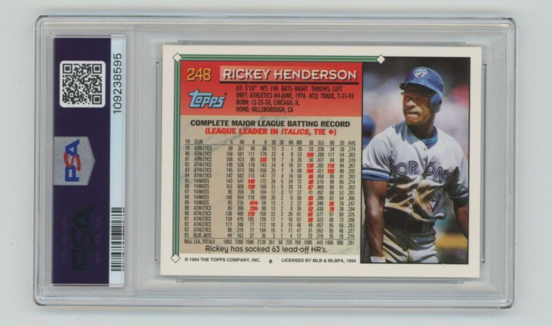 | 1994 TOPPS RICKEY HENDERSON PSA 8 TORONTO BLUE JAYS #248 | ||||||||||||||||||