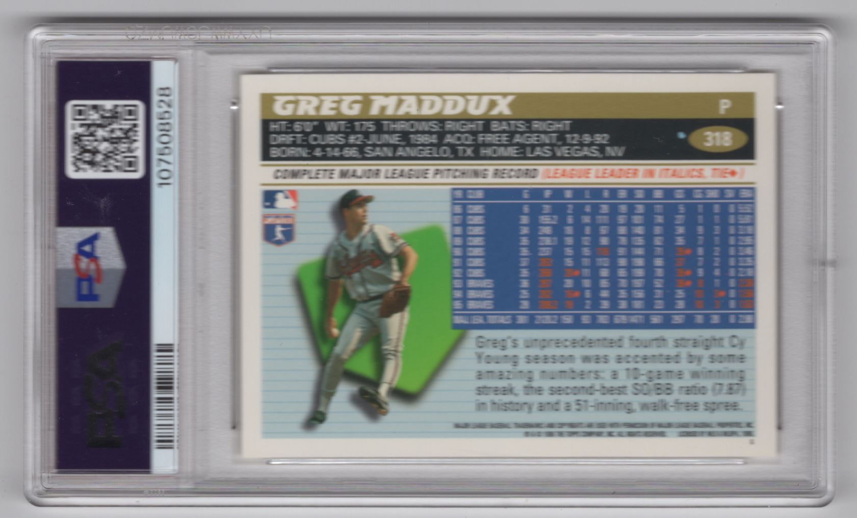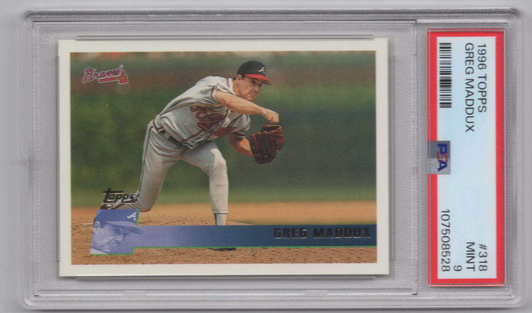 Rare 1996 Topps Greg Maddux PSA 9 Atlanta Braves #318 card, one of only 34 in existence. Add this gem to your collection today!